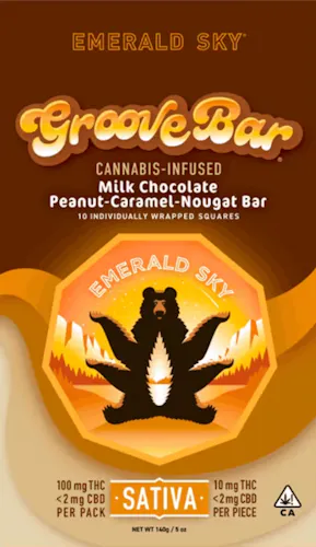 GrooveBar is a delightful treat inspired by the great classic candy bars. Rich milk chocolate, roasted peanuts for the perfect crunch, sweet and creamy caramel, all layered together with our incredibly smooth nougat. Each piece is thoughtfully infused with just the right touch of cannabis to elevate the experience. Enjoy your journey.