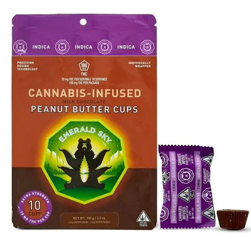 Need a sweet treat to take the edge off? Try Emerald Sky's delicious milk chocolate peanut butter cups -- infused with a tasteless indica THC, they will leave you with a very relaxed high. Creamy and flavorful, each cup is individually wrapped. 10 servings per package. Each serving contains 10 mg of THC, using a proprietary dosing technology. Vegetarian. Ingredients: Milk Chocolate (Sugar, Cocoa Butter, Chocolate, Whole Milk, Soy Lecithin (An Emulsifier), Sea Salt, Vanilla Extract), Peanut Butter (Peanuts, Salt), Sugar, Fractionated Palm Kernel Oil, Lactose (Milk), Salt, Soy Lecithin (An Emulsifier), Cannabis Extract. (License No. CDPH-10002851)