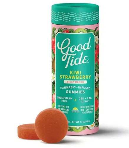 Lean into relaxation and recovery with Good Tide Kiwi Strawberry THC:CBD:CBG gummies. Hybrid single-strain rosin along with an extra boost of CBG are wrapped up with juicy kiwi strawberry flavors to help you fully reset.?