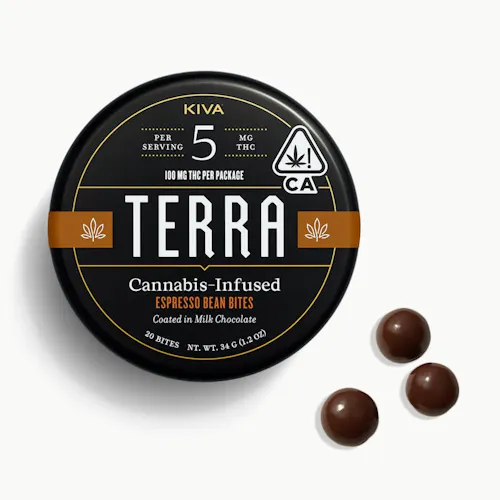 Kiva Terra Bites are crafted from micro-roasted Tanzanian coffe beans and coated in Kiva Dark Chocolate. With 5mg of THC per bite, Terra offers the most convenient dosing available. The reclosable container makes it easy to enjoy a little now, and with 100mg THC in each tin, a little later, too. 20 bites/ 5mg THC per bite. Allergy Warning: Contains milk. May contain traces of nuts