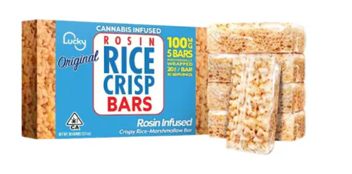 Introducing the *NEW* Original Lucky Crispy Rosin Rice Bars 100MG by Froot! ??? These rosin-infused treats elevate the classic crispy rice-marshmallow bars with a potent twist. Each package contains five individually wrapped bars, with 20MG of THC per bar, making it easy to control your dosage while indulging in nostalgic flavors. Whether you're a seasoned cannabis connoisseur or new to edibles, these bars offer a delightful and discreet way to enjoy your experience. Perfect for on-the-go enjoyment or a sweet treat at home