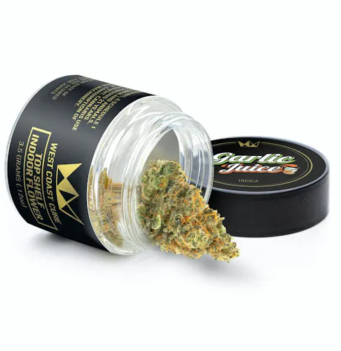 West Coast Cure's Garlic Juice is a delectable Indica-dominant hybrid flower created through crossing GMO and Papaya strains from Oni Seed Co. With a robust and complex spicy aroma with a subtle pine undertone, this strain has a flavor that is nothing short of delightful. Infused with the zesty garlic and clove's essence of GMO and a touch of Papaya's fruity sweetness, this cultivar is perfect for unwinding after work or on a leisurely day off. The potent and long-lasting effects of this strain will undoubtedly please any Indica enthusiast.