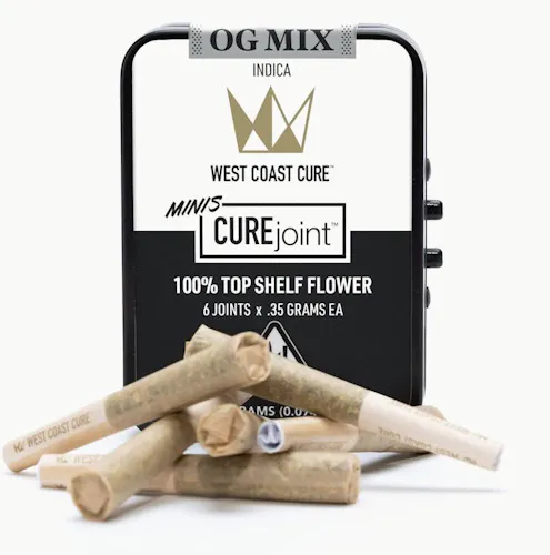 OG Mix .35g mini pre-rolls by West Coast Cure contain 6 personal-sized joints. Rolled from the same de-stemmed, 100% top-shelf flower utilized in WCC’s full-sized CUREjoints, they’re perfect for single-use sharing or that solo smoke session. A covid compliant pre-roll, the flower used is a blend of several of our favorite OG Kush strains. Providing further proof that ‘big things come in small packages,’ these mini joints offer a gassed-up OG flavor and strong Indica high.
